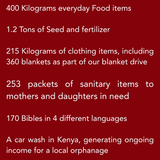 With a primary focus on Kenya as its inaugural target, Project Relief was also able to bring relief in the following countries: South Africa, Kenya and Egypt.
